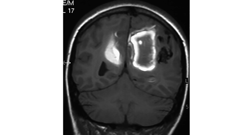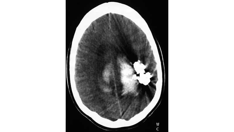 - Μαγνητική τομογραφία σε Τ1 ακολουθία, οβελιαία τομή. Ενδοεγκεφαλικό αιμάτωμα μετά από ρήξη αρτηριοφλεβώδους δυσπλασίας του αριστερού βρεγματικού λοβού σε κορίτσι ηλικίας 15 ετών.