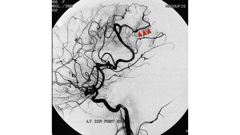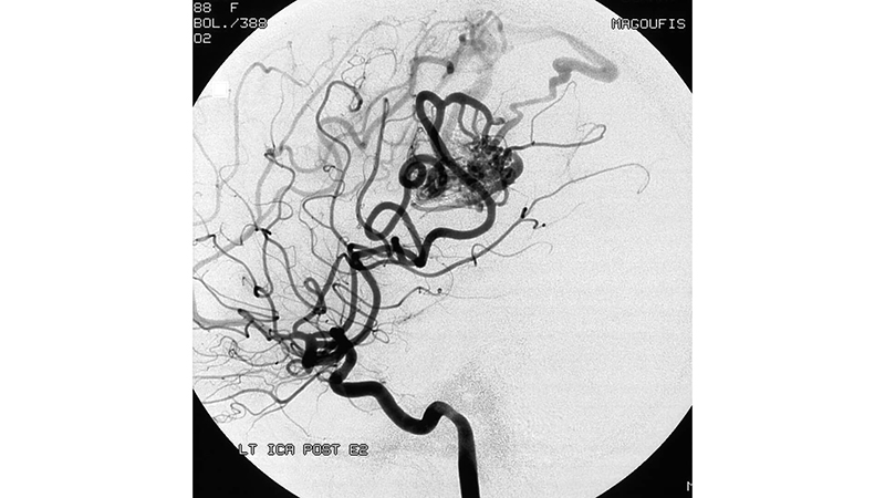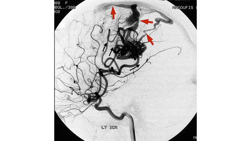 - Πλάγια λήψη εγχύσεως στην αριστερή έσω καρωτίδα. Διακρίνονται οι τρείς κύριοι τροφοφόροι κλάδοι που αρδεύουν της αρτηριοφλεβώδη φωλεά (μαύρα βέλη). Η φλεβική παροχέτευση γίνεται μέσω διατεταμένων βρεγματικών φλεβών προς τον άνω οβελιαίο κόλπο. Βλέπουμε τις εστιακές στενώσεις στο φλεβικό σκέλος που ευθύνονται γιά την αύξηση της πιέσεως μέσα στην φωλεά και γιά την αιμορραγία (κόκκινα βέλη).