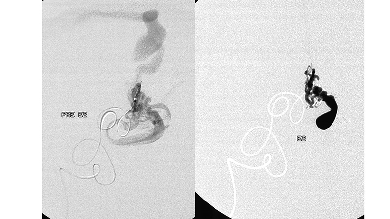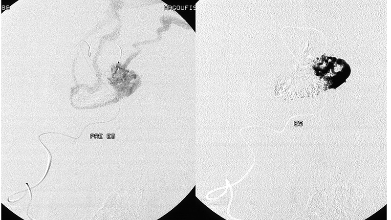 - Υπερεκλεκτικός καθετηριασμός και εμβολισμός από θέση εντός της φωλεάς, με καλή διείσδυση του εμβολικού υλικού στην φωλεά.