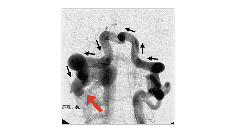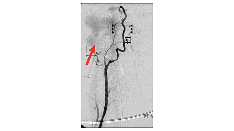 - Εκλεκτική αγγειογραφία της δεξιάς σπονδυλικής αρτηρίας σε προσθιοπίσθια λήψη. Η δεξιά σπονδυλική αρτηρία είναι υποπλαστική. Διακρίνουμε το αρτηριακό τόξο του οδόντα του Α2 σπονδύλου (αιχμές μαύρων βελών) και ευμεγέθη ριζομυελική αρτηρία που αιματώνει την προσθία νωτιαία αρτηρία στο ύψος του αυχενικού μυελού (μαύρα βέλη). Από την προσθία νωτιαία αρτηρία διά της σπονδυλοβασικής συμβολής, με αναστροφή στην δεξιά σπονδυλική αρτηρία μέχρι το Α2 τμήμα, σκιαγραφείται η επικοινωνία (κόκκινο βέλος).