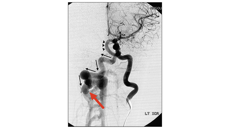 Η φλεβική παροχέτευση γίνεται με διάταση του συστήματος της δεξιάς οπισθίας σφαγίτιδος φλέβας με συμφορηση των παρασπονδυλικών εξωσκληρίδιων φλεβών. - Εκλεκτική αγγειογραφία της αριστερής έσω καρωτίδος αρτηρίας σε προσθιοπίσθια λήψη. Διά μέσου της οπισθίας αναστομωτικής αρτηρίας με αναστροφή της ροής στην βασική αρτηρία (αιχμές μαύρων βελών), και την δεξιά σπονδυλική αρτηρία (μαύρα βέλη), διακρίνεται η σπονδυλο-σπονδυλική επικοινωνία (κόκκινο βέλος). Υπάρχει λόγω αναστροφής της ροής στσπονδυλοβασικό σύστημα, υποκλοπή στην αιμάτωση των στοιχείων του οπισθίου κρανιακού βόθρου.