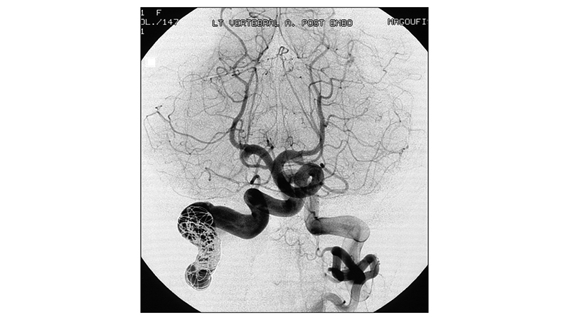 - Με προσπέλαση από την αριστερή σπονδυλική, αποφράχθηκε με coils το A1–A2 τμήμα της δεξιάς σπονδυλικής αρτηρίας, μαζί με το σημείο της επικοινωνίας. Διακρίνουμε την αποκατάσταση της ορθόδρομης ροής στο σπονδυλοβασικό σύστημα με εξάλειψη της υποκλοπής.
